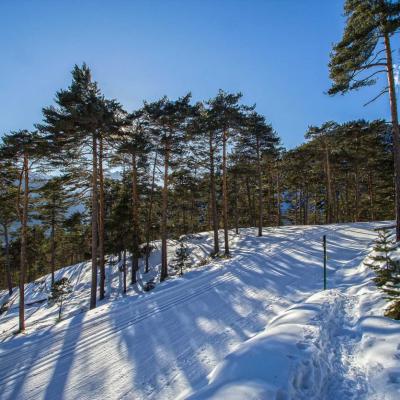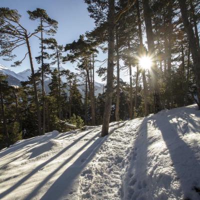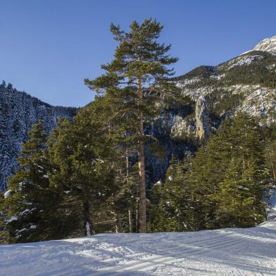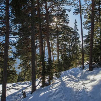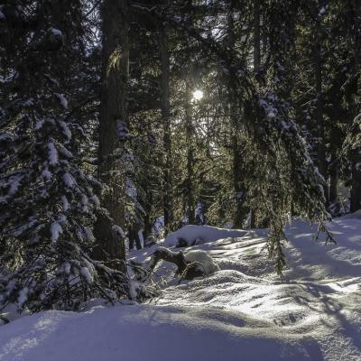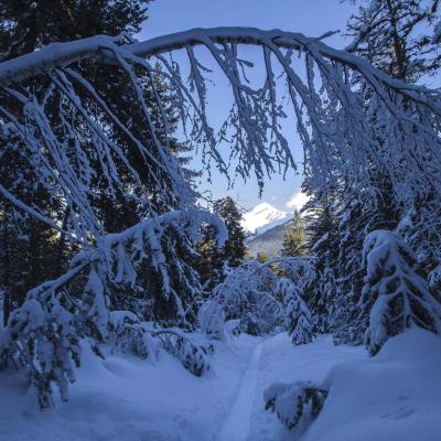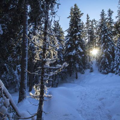 Ayant pris la piste qui revient sur la station, vous trouverez après un quart d'heure de marche environ, un petit sentier qui part sous les pins à votre gauche, c'est le "sentier des biches", très agréable à parcourir avec le soleil en étoile à travers les branches, un secteur des plus calmes que je n'ai pas suivi jusqu'au bout, étant arrivé à peu près au-dessus du village, un passage jusqu'alors ignoré du soleil m'a plongé dans un décor dont je n'aurai jamais osé rêver; ignoré du soleil, parce que les branches étaient toutes couvertes de givre qui avait tout figé et en jouant avec le soleil qui apparaissait par endroits pour des étincellements de toute beauté. J'ai donc pris directement à droite ce sentier à 45° qui m'a ramené tout doucement au bord des pistes que je sentais de plus en plus proches, grâce aux voix des skieurs qui étaient certainement très loin d'imaginer le fabuleux décor qui se trouvait tout près d'eux.