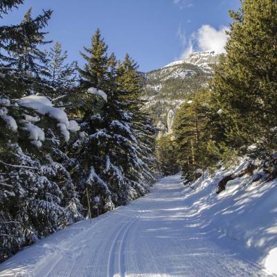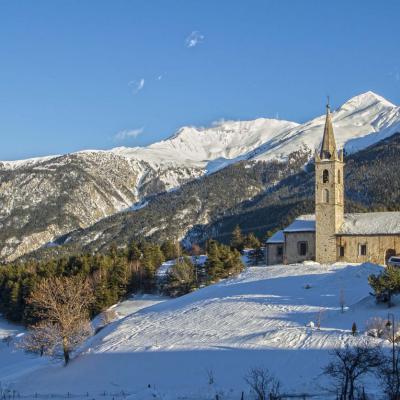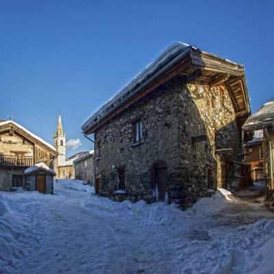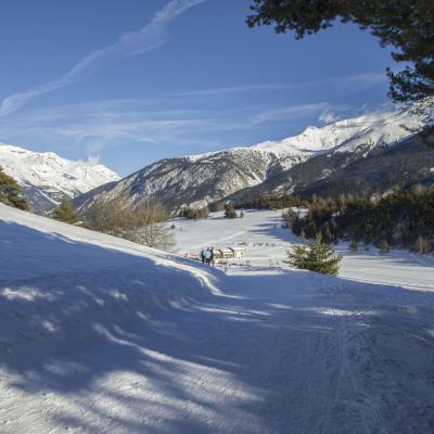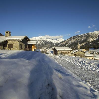 Un parking se trouve à proximité de l'église, je vous suggère de vous y arrêter et de démarrer en traversant le village dans sa longueur, sur la droite des habitations que l'on voit; rejoindre les pistes de fond en évitant de trop s'attarder sur elles, de manière à ne pas gêner les skieurs et d'âbimer les pistes, en prenant comme direction le monolhite d'Aussois. À proximité du monolhite, j'ai bifurqué sur la droite, au bord d'une piste qui revient sur la station. Je ne suis pas allé jusqu'au monolhite, étant parti l'après-midi, ce n'était pas le meilleur moment pour ça, puisqu'à cette période de l'année, le soleil bascule très rapidement derrière les sommets et ce n'est pas très intéressant de s'y rendre dans ces conditions.